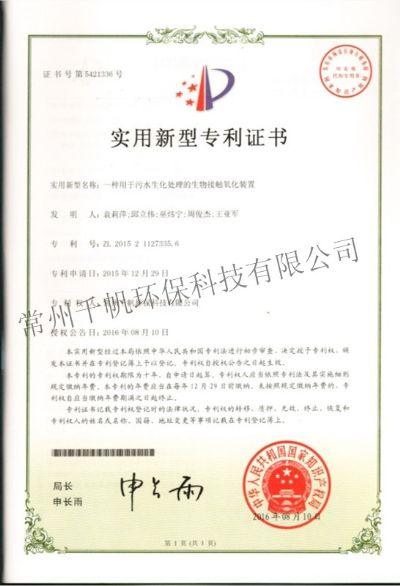 實用新型專利證書 一種用于污水生化處理的生物接觸氧化裝置
